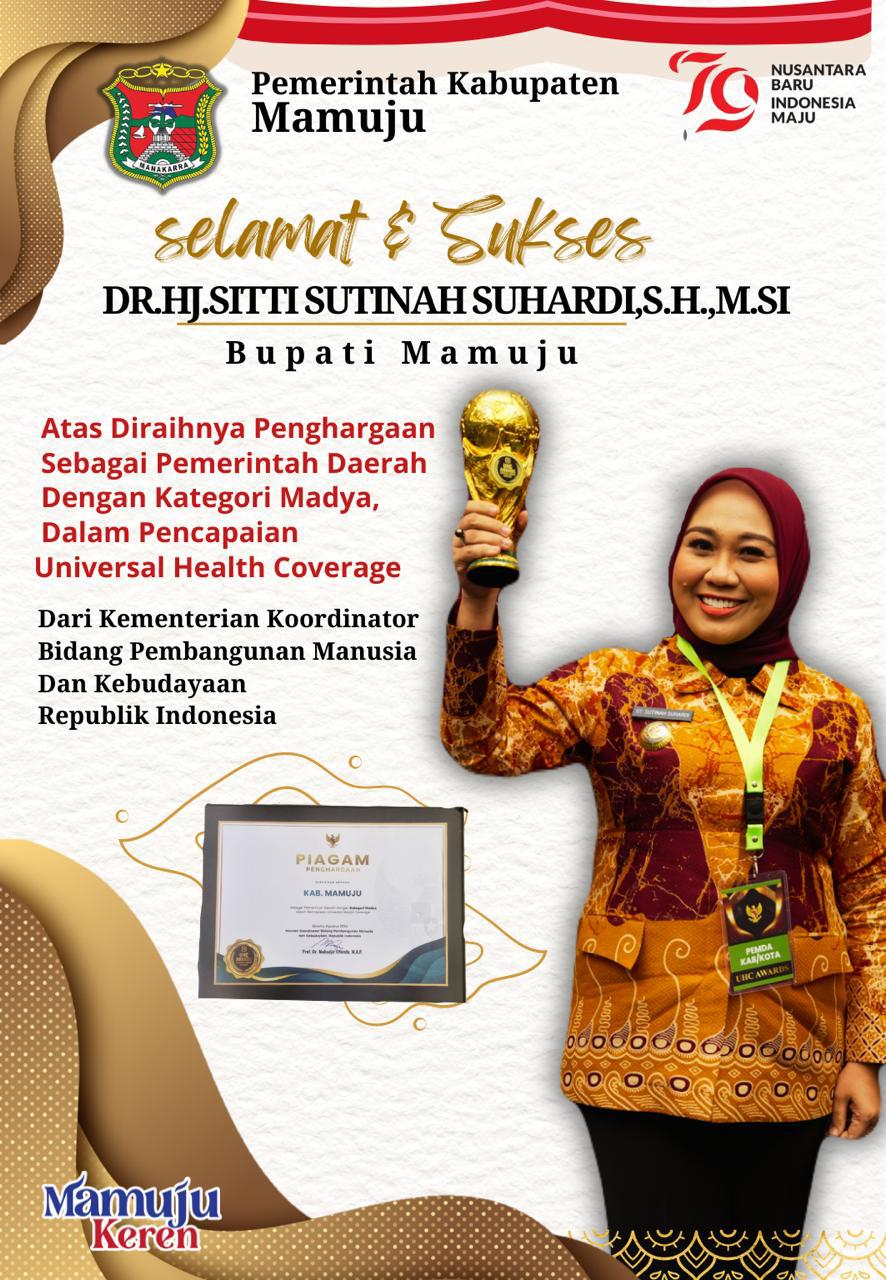 Bupati Mamuju, Sitti Sutinah Suhardi turut menerima UHC Award yang digelar di The Krakatau Grand Ballroom TMII Jakarta. Dia mengaku bangga telah mampu mempertahankan komitmen untuk menghadirkan layanan kesehatan gratis bagi masyarakat mamuju.